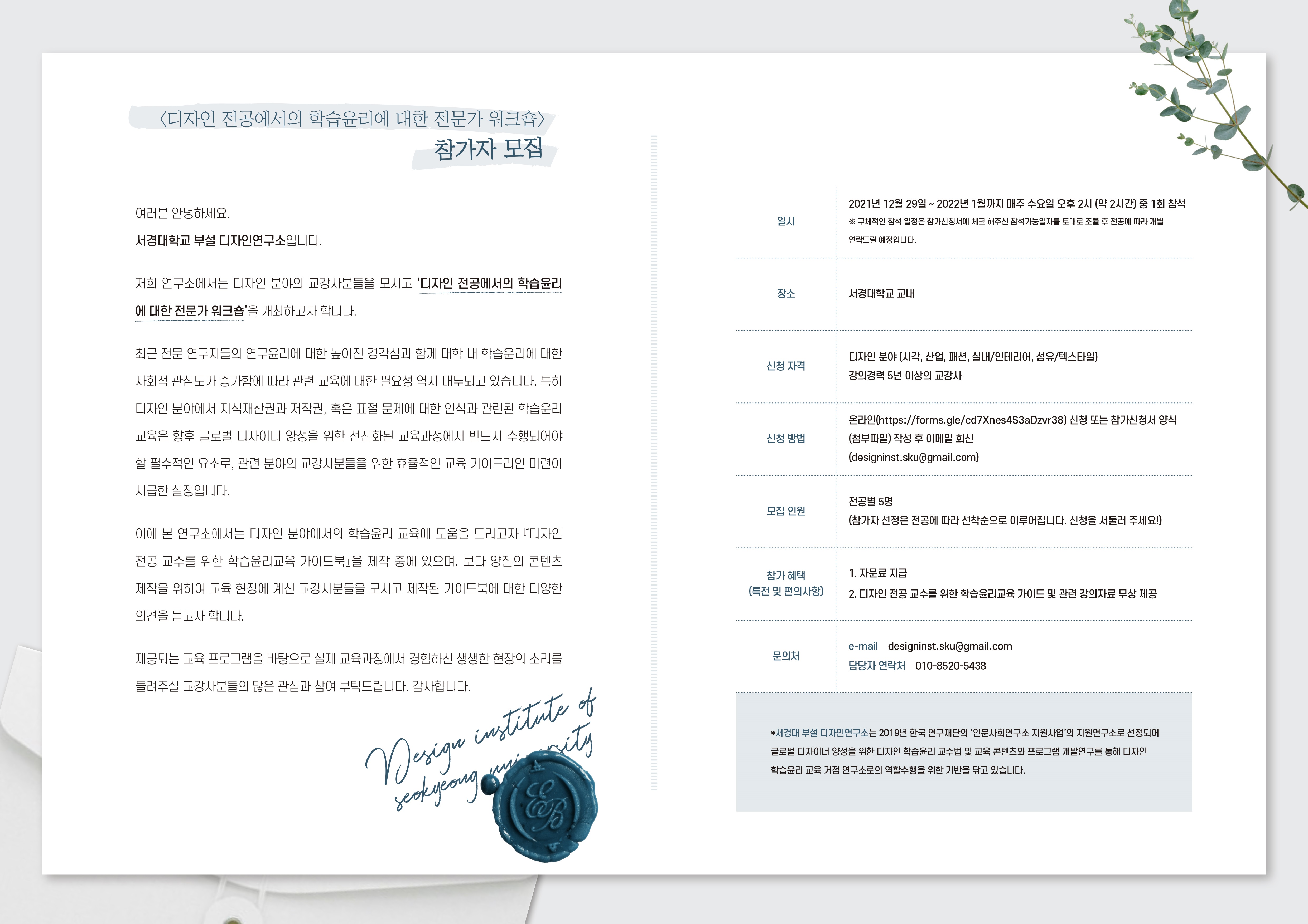 <디자인 전공에서의 학습윤리에 대한 전문가 워크숍> 참가자 모집 · 일시 : 2021년 12월 29일 ~ 2022년 1월까지 매주 수요일 오후 2시 (약 2시간) 중 1회 참석 ※ 구체적인 참석 일정은 참가신청서에 체크 해주신 참석가능일자를 토대로 조율 후 전공에 따라 개별 연락드릴 예정입니다. · 장소 : 서경대학교 교내 · 신청 자격 : 디자인 분야 (시각, 산업, 패션, 실내/인테리어, 섬유/텍스타일) 강의경력 5년 이상의 교강사 · 신청 방법 : 온라인(https://forms.gle/cd7Xnes4S3aDzvr38) 신청 또는 참가신청서 양식(첨부파일) 작성 후 이메일 회신(designinst.sku@gmail.com) · 모집 인원 : 전공별 5명 (참가자 선정은 전공에 따라 선착순으로 이루어집니다. 신청을 서둘러 주세요!) · 참가 혜택(특전 및 편의사항) : 1. 자문료 지급 2. 디자인 전공 교수를 위한 학습윤리교육 가이드 및 관련 강의자료 무상 제공 · 문의처 : (e-mail) designinst.sku@gmail.com (담당자 연락처) 010-8520-5438 |