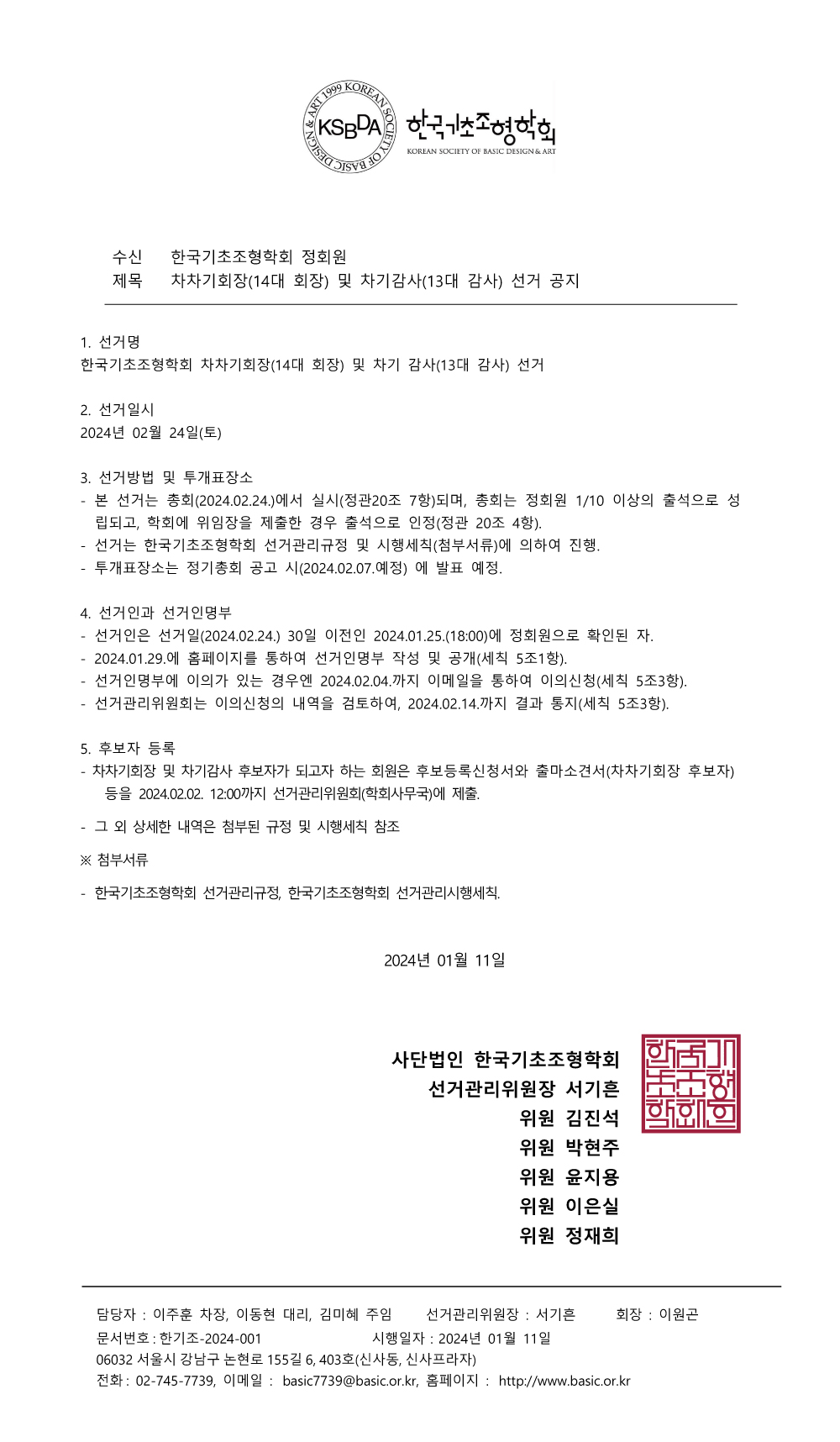 한국기초조형학회 차차기회장(14대 회장) 및 차기 감사(13대 감사) 선거 입후보자 등록 안내