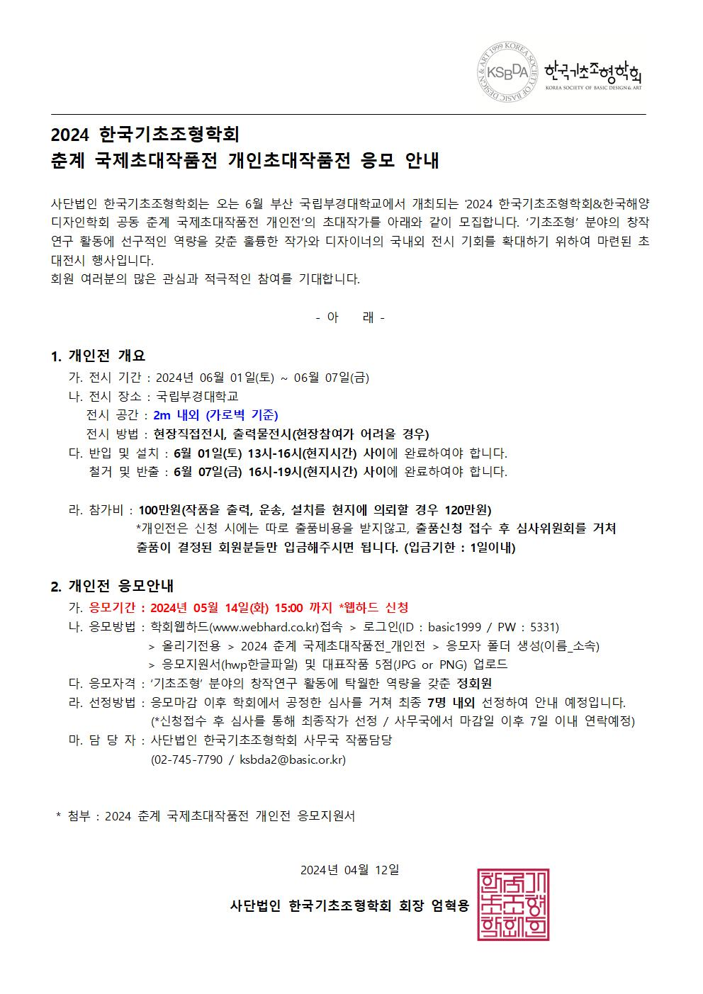 2024 한국기초조형학회 춘계 국제초대작품전 개인전 응모 안내