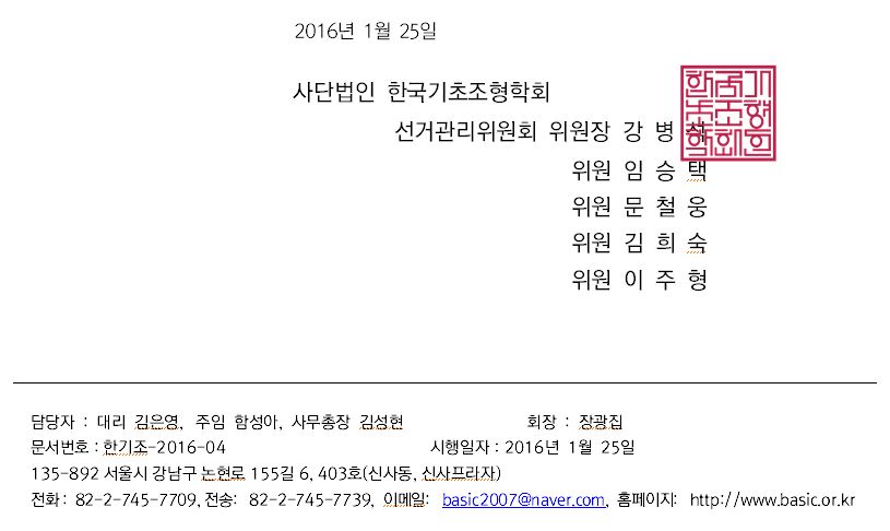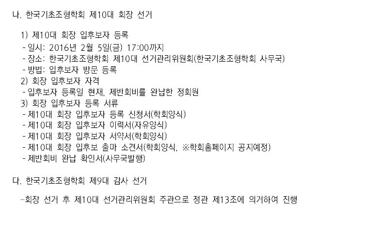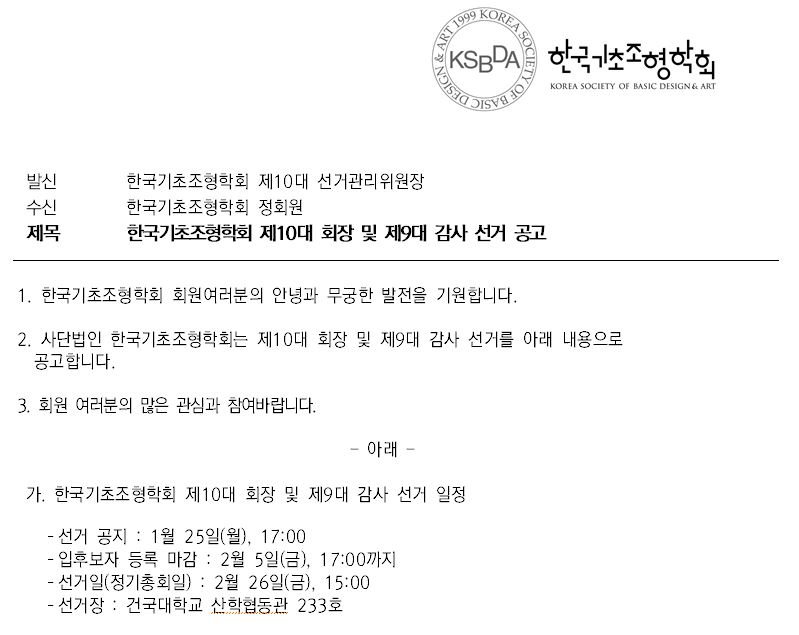 한국기초조형학회 제10대 회장 및 제9대 감사선거 공고