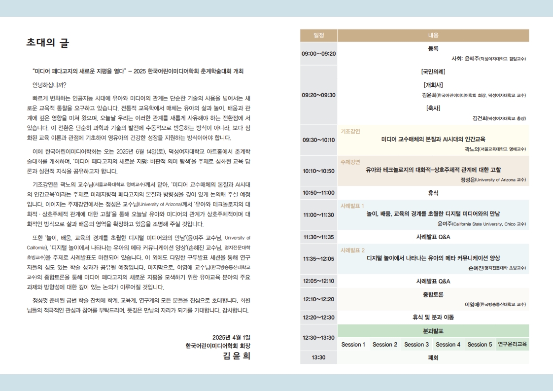 다가오는 2025년 6월 14일(토)에 개최되는 2025년 한국어린이미디어학회 춘계학술대회를 안내해 드립니다.
