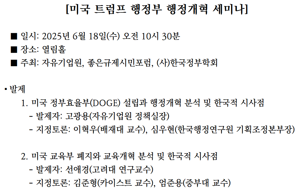 자유기업원, 좋은규제시민포럼, (사)한국정부학회가 [미국 트럼프 행정부 행정개혁 세미나]를 개최합니다.