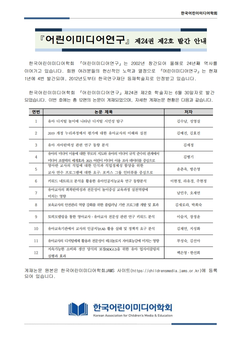 [한국어린이미디어학회] 어린이미디어연구 제24권 제2호 발간 안내