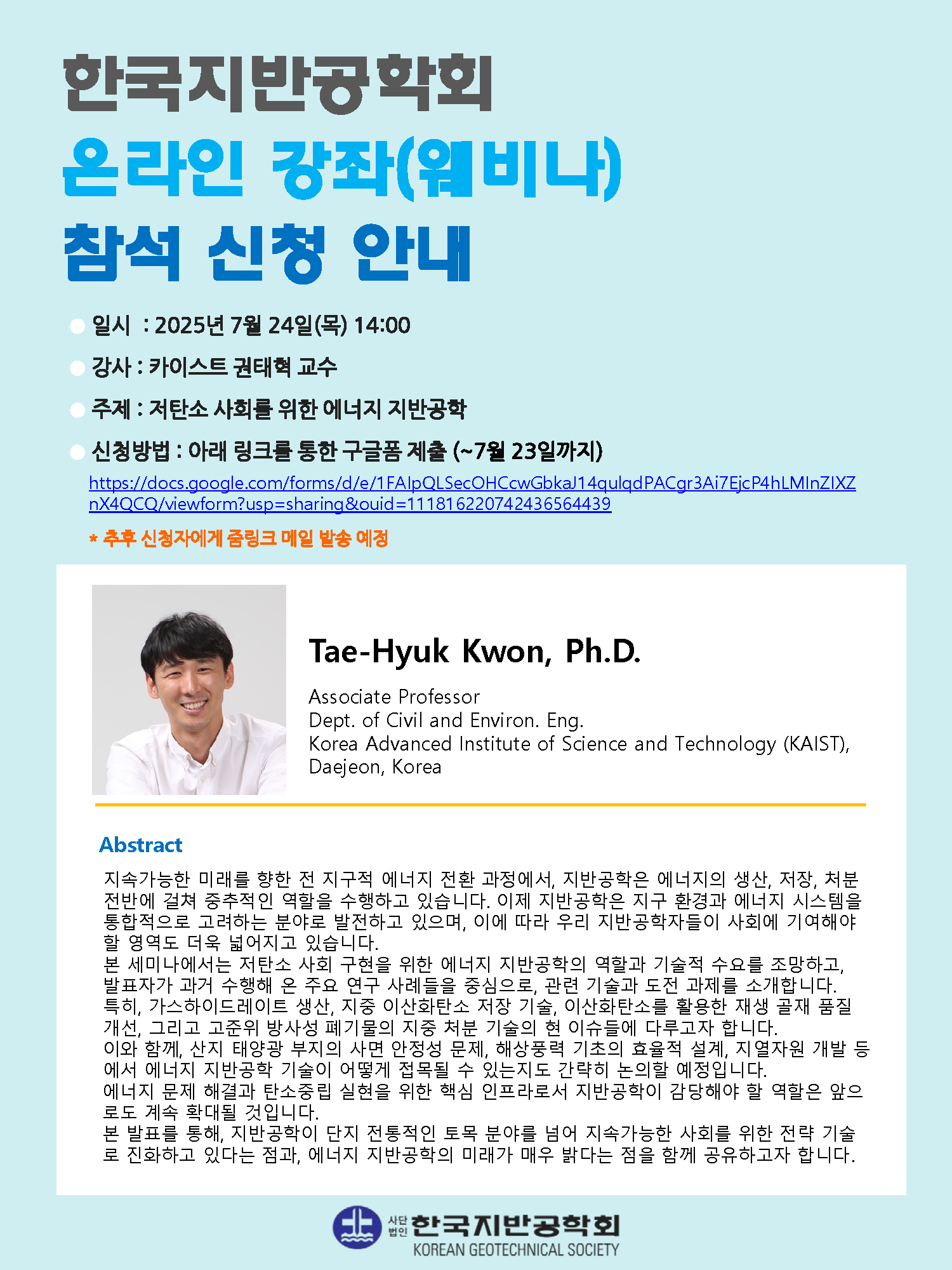 온라인 강좌(웨비나)에 참석을 희망하시는 학회 회원분께서는 아래 바로가기 링크에 정보를 입력하여