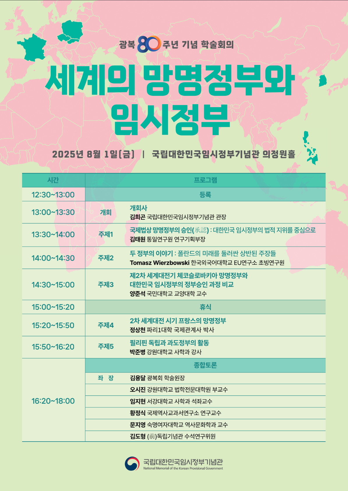 국립대한민국임시정부기념관에서는 광복 80주년을 맞이하여 「세계의 망명정부와 대한민국 임시정부」라는 주제로 학술회의를 개최하고자 합니다.