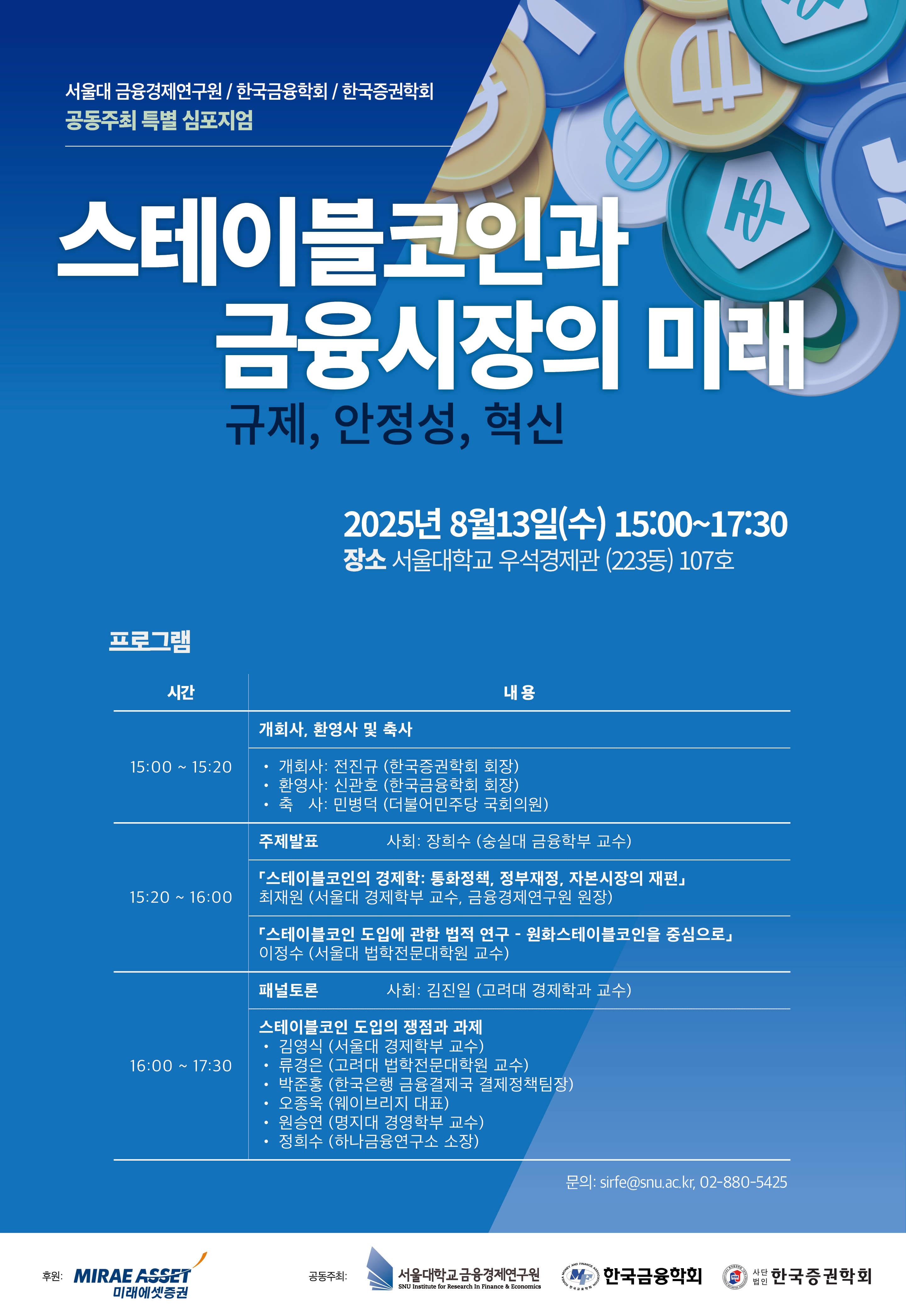 8월 13일 『스테이블코인과 금융시장의 미래: 규제, 안정성, 혁신』한국증권학회-서울대금융경제연구원-한국금융학회 공동주최 특별 심포지엄 개최 안내