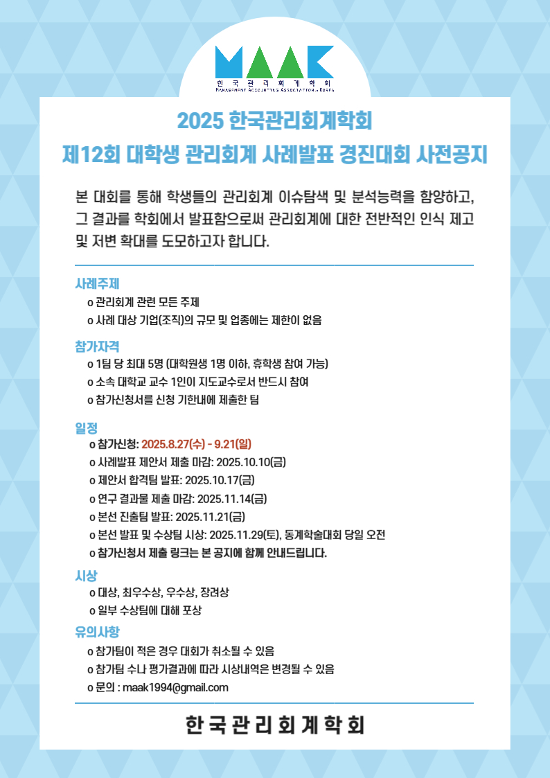 2025 한국관리회계학회 '통합하계국제학술대회' 발표 논문 모집