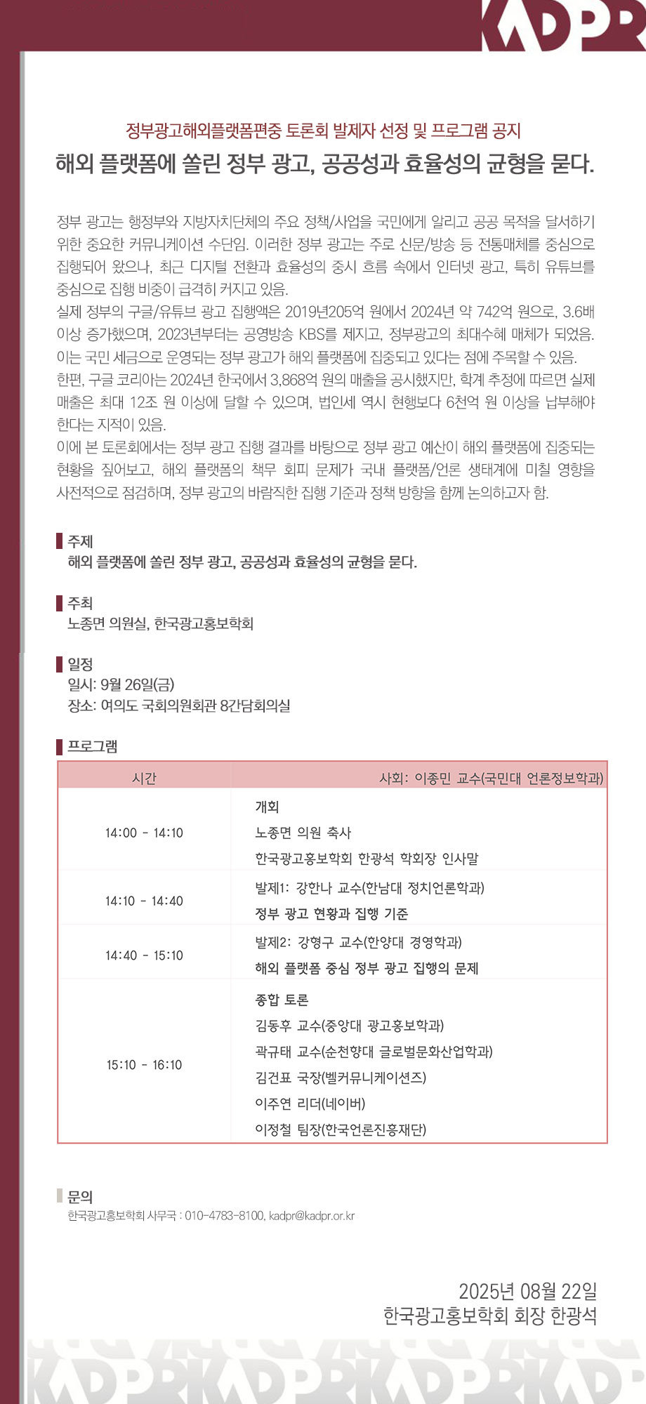 [KADPR]정부광고해외플랫폼편중 토론회 발제자 선정 및 프로그램 공지