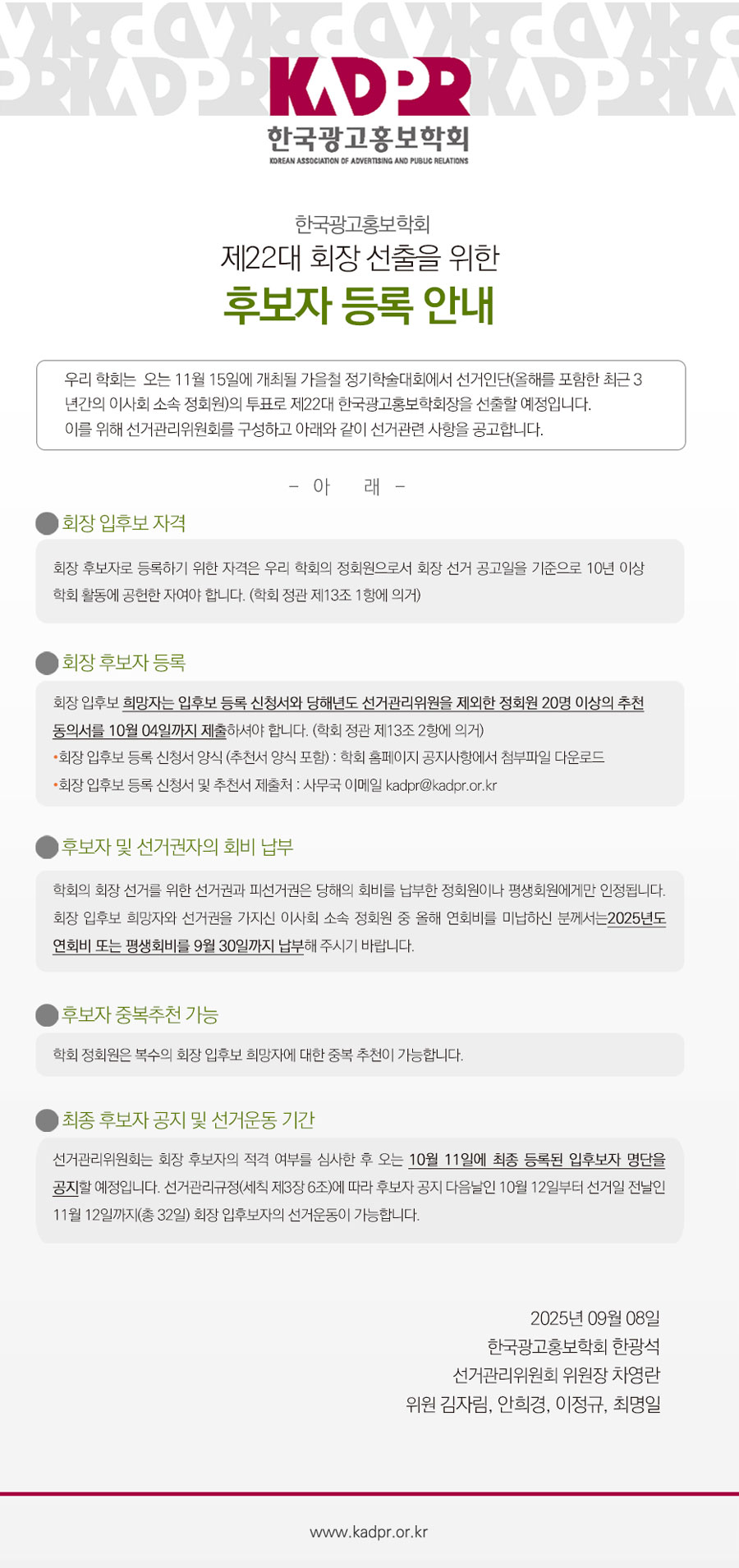 [KADPR]한국광고홍보학회 제22대 회장 선출을 위한 후보자 등록 안내