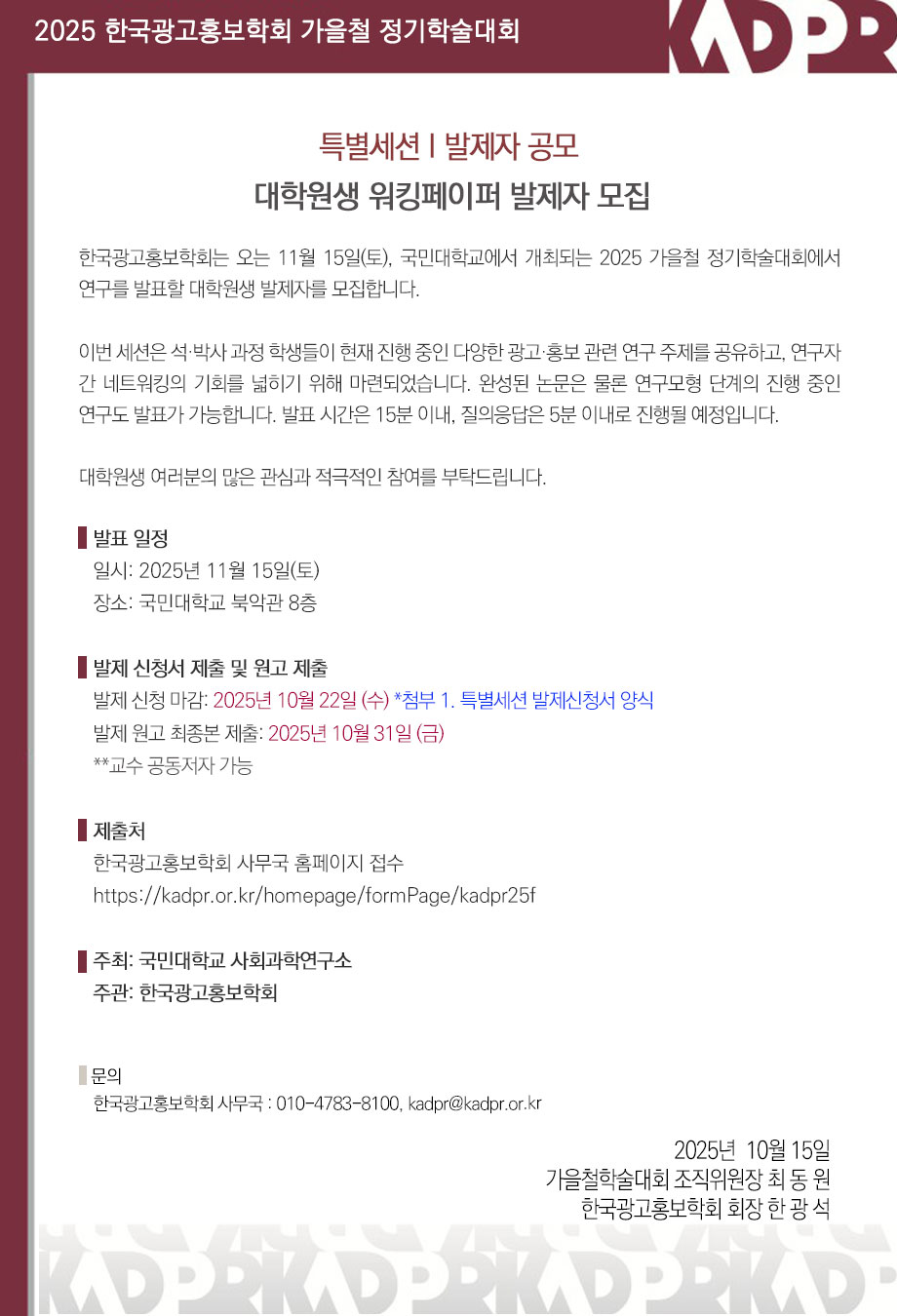[KADPR] 2025 가을철 정기학술대회 특별세션 I 발제자 공모(대학원생 발표 신청)