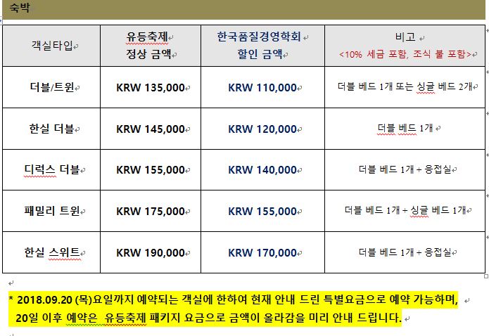 2018 한국품질경영학회 추계 학술대회 일정동안 이용가능한 숙박시설에 대한 안내 말씀 드립니다.