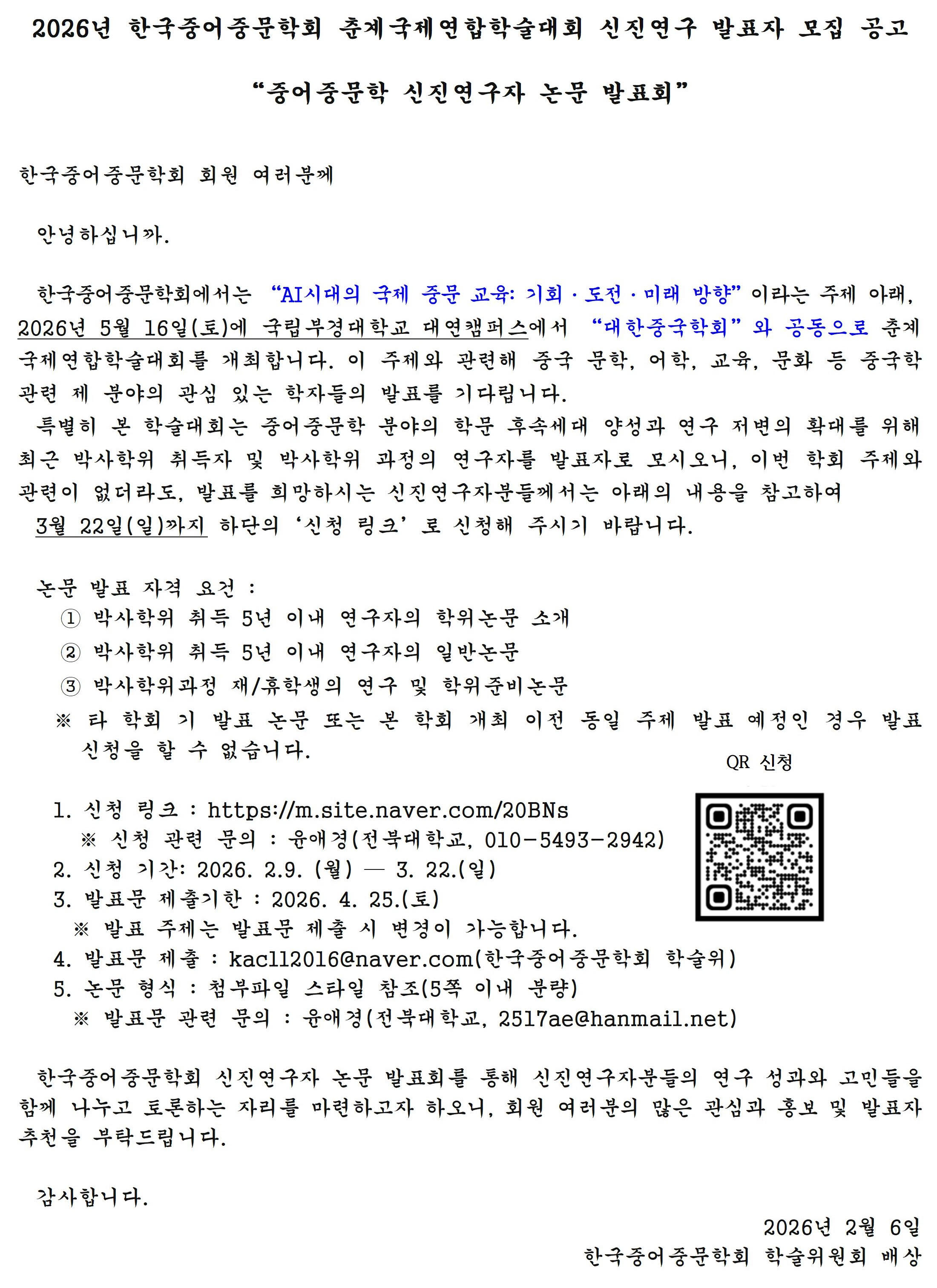 2026년 한국중어중문학회 춘계국제연합학술대회 신진연구 발표자 모집 공고