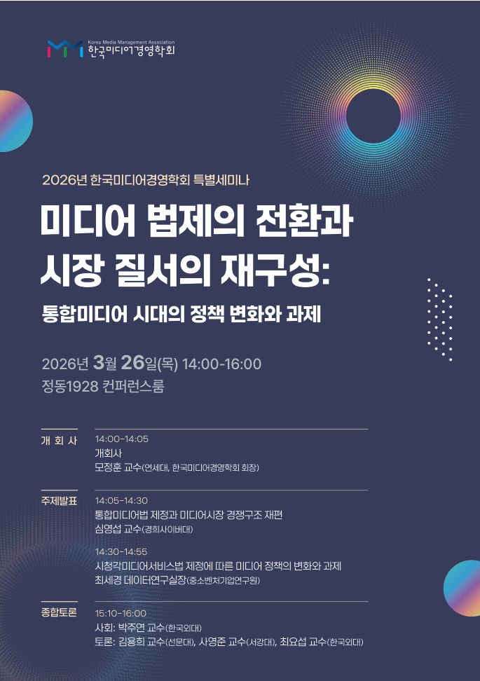 한국미디어경영학회가 2026 특별세미나 <미디어 법제의 전환과 시장 질서의 재구성: 통합미디어 시대의 정책 변화와 과제>를 개최합니다.