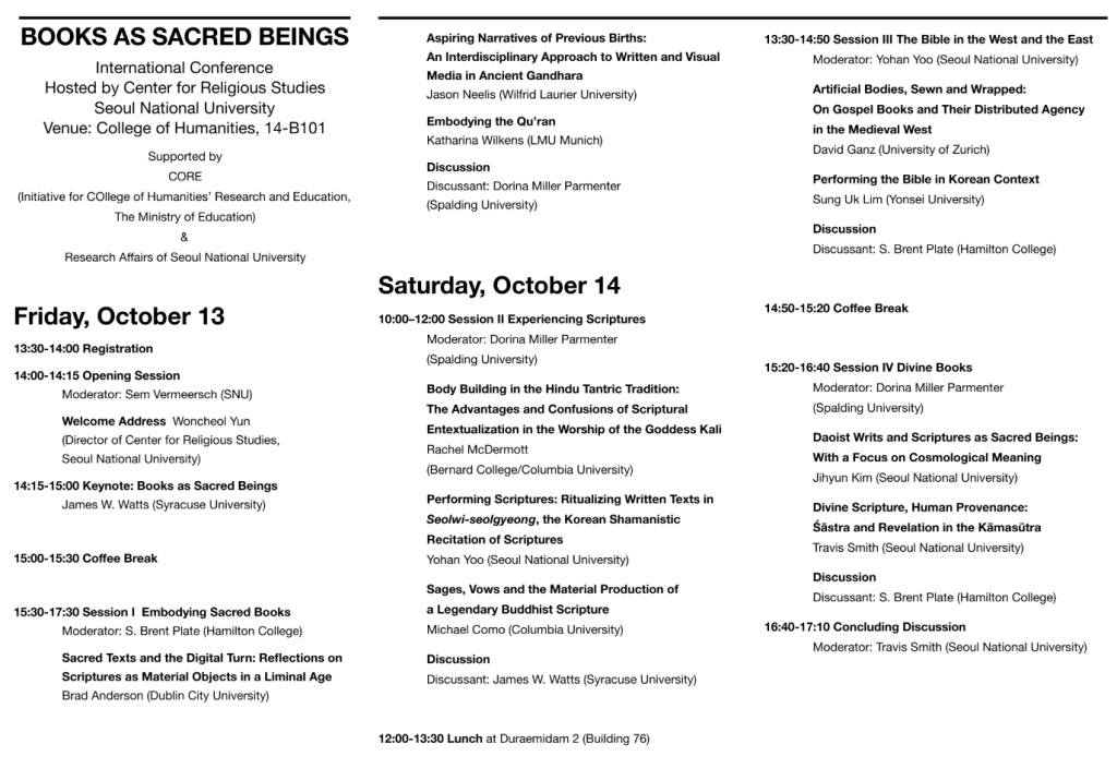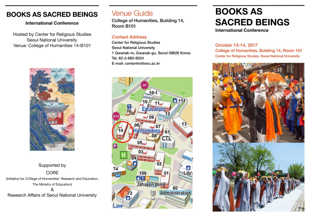 다가오는 2017년 10월 13일(금)~14일(토) 서울대학교 종교문제연구소가 주관하는 'Books as Sacred Beings' 국제학술대회가 서울대학교 인문대 14동에서 열립니다. 관심 있는 선생님들의 많은 참여를 바랍니다.