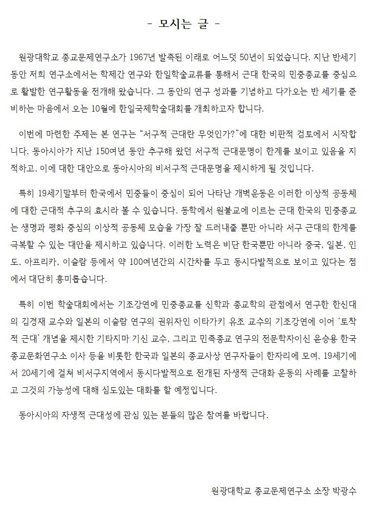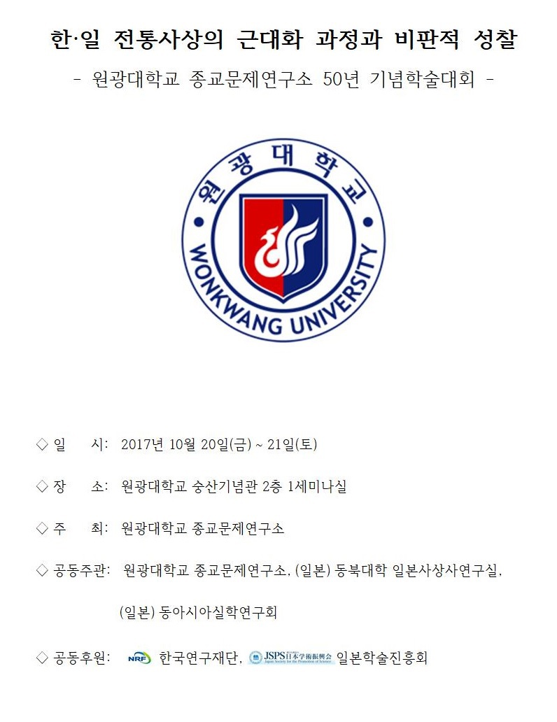 [안내] 원광대학교 종교문제연구소 50년 기념학술대회: 한·일 전통사상의 근대화 과정과 비판적 성찰