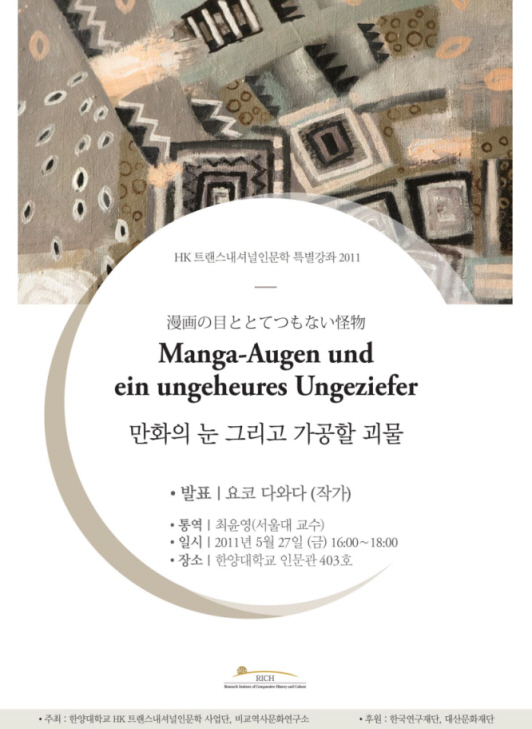 이번 특별 강좌에는 독일어와 일본어의 경계선에서 두 언어 안에 내재된 외국어적인 모습을 이끌어내며 양국 문단 모두로부터 주목받아온 작가 요코 다와다가 < 만화의 눈 그리고 가공할 괴물 >이라는 제목으로 강좌를 진행합니다.