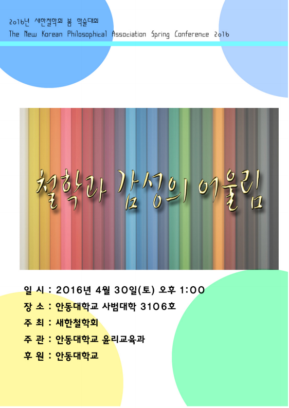 2016년 새한철학회 봄 학술대회를 '철학과 감성의 어울림이란 주제로 4월 30일 안동대학교 사범대학에서 개최됩니다. 많은 참석 부탁 드립니다. 자세한 사항은 첨부된 안내장을 참조하시기 바랍니다.