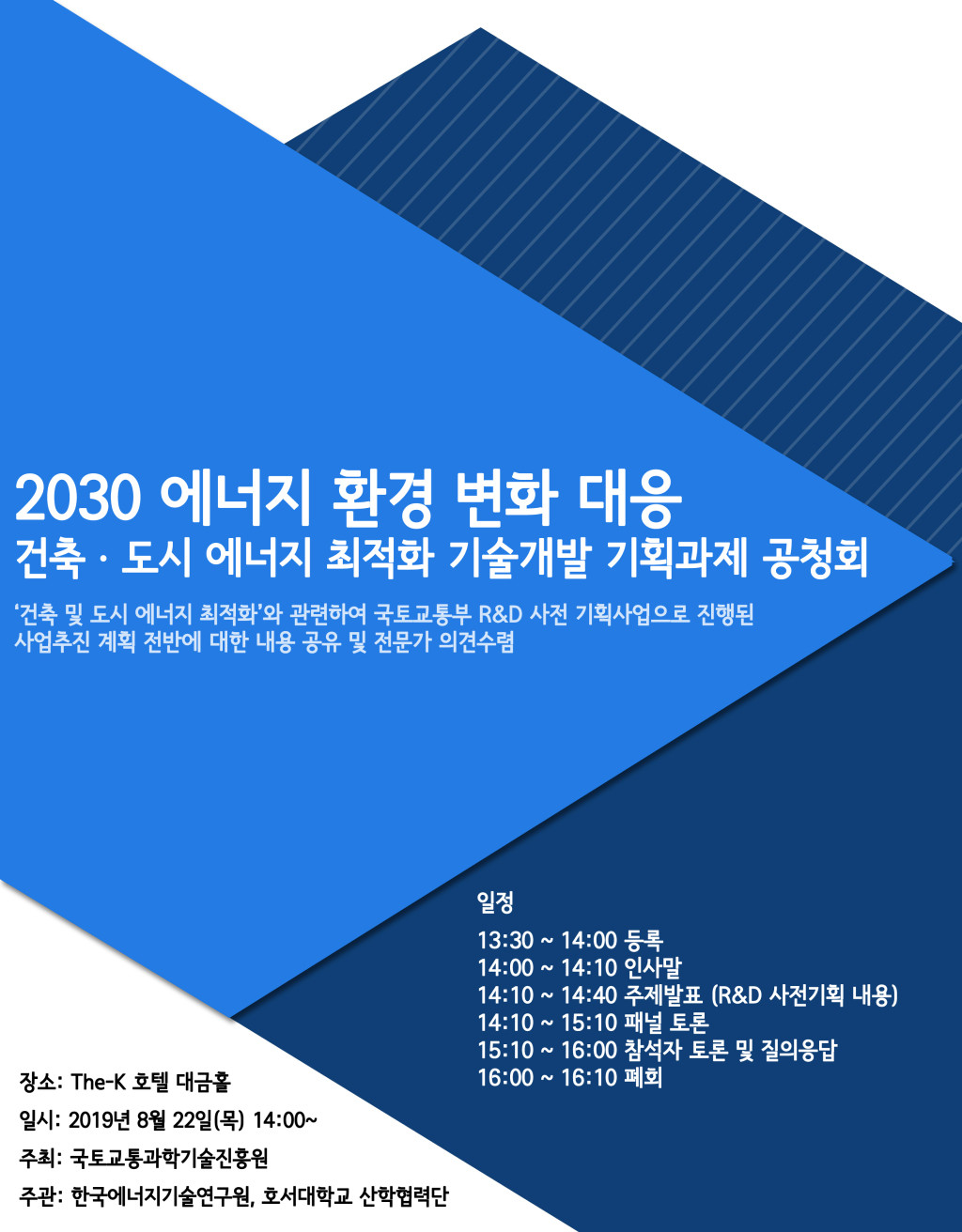 국토교통부 R&D 사전 기획사업으로 진행된 ‘건축 및 도시 에너지 최적화’와 관련하여 사업추진 계획 전반에 대한 발표와 전문가 의견수렴 및 토론을 위한 공청회가 개최됩니다.