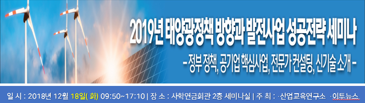 산업교육연구소에서는 오는 12월 18일(화) 여의도 사학연금회관에서 '2019년 태양광정책 방향과 발전사업 성공전략 세미나 -정부 정책, 공기업 핵심사업, 전문가 컬설팅, 신기술 소개-'를 개최합니다.