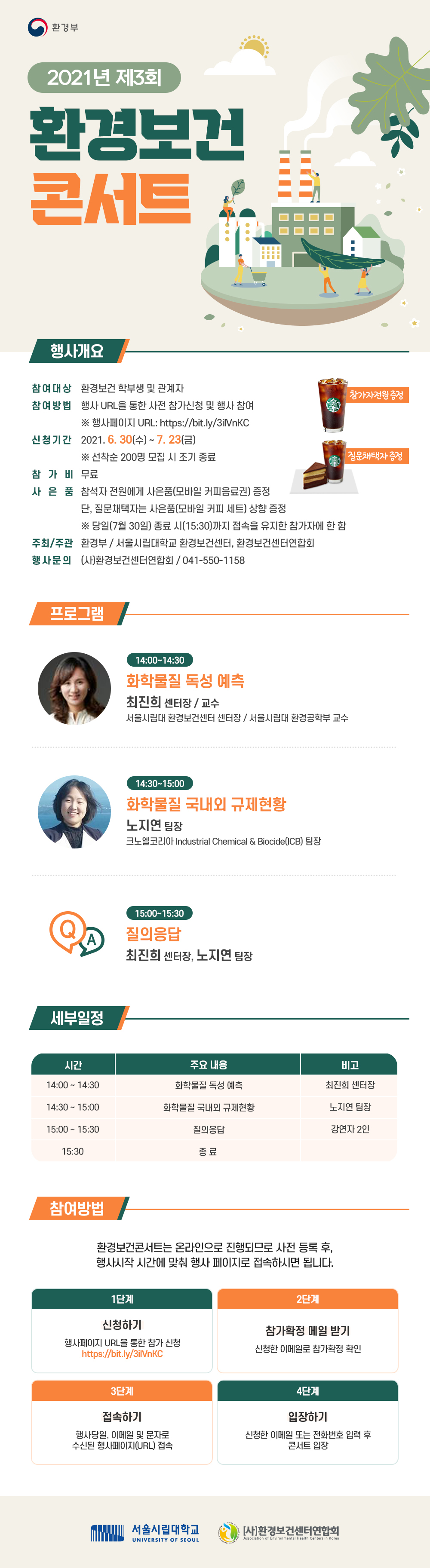 환경부에서 환경보건전문가들과 함께 환경보건 관련 전공 학생 및 관계자를 대상으로 환경보건에 관한 강연과 더불어 참여자들과 질문·답변의 시간을 갖는「환경보건콘서트」를 개최하고자 하오니 적극 참여하시어 환경보건에 관한 정보 교류의 장이 되실 수 있기를 희망합니다.