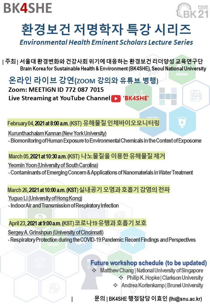 서울대학교 보건대학원 환경보건학과 BKFOUR 환경변화와 건강사회 위기에 대응하는 환경보건 리더양성 교육연구단에서는 환경독성학과 환경보건학 분야의 저명한 해외 석학을 모시고 온라인 특강을 개최합니다.