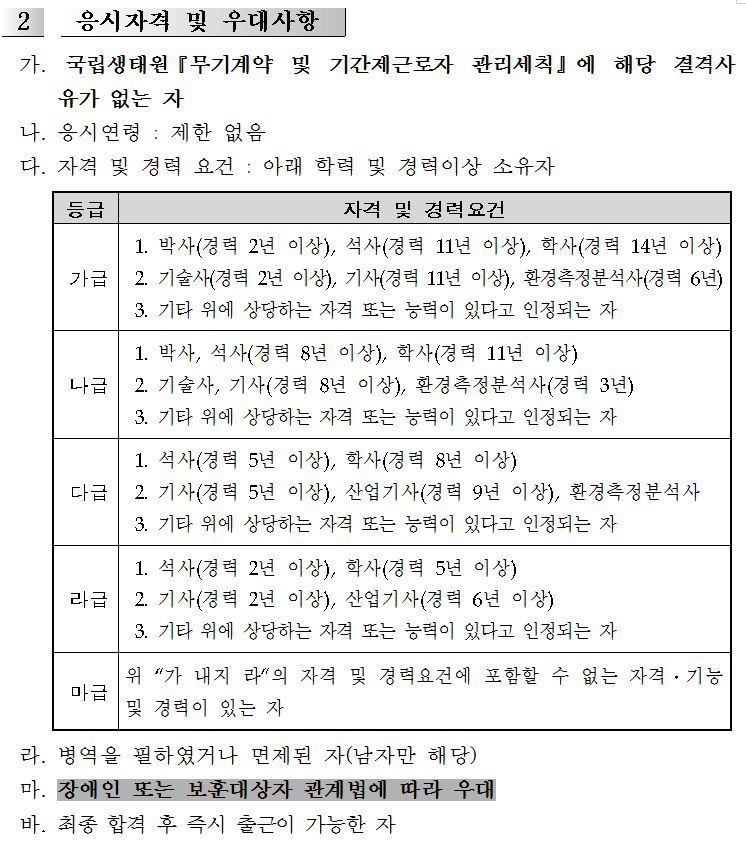 3. 근무처 및 보수 가. 근 무 처 : 국립생태원(충청남도 서천군 마서면 송내리 소재) 나. 보 수 : 국립생태원 내부규정에 따름 ※ 전문위원(가급 3,136,890원, 나급 2,800,870 급 2,504,050 라급,2.182.500 원,마급 1,914,400) ※ 4대보험 가입 및 시간외 수당 별도 지급 4. 시험방법 및 합격자 발표 가. 1차 : 서류전형 ○ 방법 : 응시자가 제출한 제반 서류를 토대로 응시요건 적합여부 및 기본 자질을 심사하여 3배수 이내 선발 ○ 서류전형 합격자 발표 : 2018.4.9(월) (합격자에 한해 E-mail 또는 SMS 개별 통보) 나. 2차 : 면접시험 ○ 면접일자 : 2018.4.12(목)예정 ○ 방법 : 공공기관 직원으로서 정신자세, 전문지식과 그 응용능력, 의사 표현의 정확성과 논리성, 예의․품행 및 성실성, 창의력․의지력 및 발전 가능성 등 응시자의 인성 및 자질평가 ○ 면접전형 합격자 발표 : 2018.4.13 17:00 이후 예정 (합격자에 한해 E-mail 또는 SMS 개별 통보) ※ 최종 합격자 발표일은 기관 내부사정에 따라 조정될 수 있음 ○ 면접시험 성적우수자 중 결격사유가 없는 자 채용 결정 ※ 단, 최종합격자가 근무를 포기하는 등의 사유로 추가 결원 보충이 필요한 경우 차순위 합격자를 1개월 이내 추가합격자로 결정할 수 있음 ○ 결격사유 조회 : 2018.4.13(금) 이후 예정 ○ 최종임용 : 2018.4.17.(화) 예정 5. 제출 서류 가. 응시원서 및 자기소개서(소정양식) 각 1부. 나. 학위논문요약서 및 연구실적목록 (소정양식)각 1부.(근거자료 등 이메일로 제출 가능, hk0729@nie.re.kr) 다. 최종학위증명서 사본 1부.(서류합격자에 한함) 라. 경력증명서 사본 1부.(서류합격자에 한함) 마. 자격증명서 사본 1부(서류합격자에 한함, 소지자에 한함). 바. 개인정보이용 동의서 1부. 사. 기본증명서 사본 1부.(서류합격자에 한함) ※ 서류 합격자에 한해 증빙서류 누락 시 경력 및 자격 불인정 ※ 장애인 또는 보훈대상자인 경우 증빙서류 제출. 6.응시원서 교부 및 접수 가. 교부 및 접수기간 : 2018.3.26.(월)~2018.4.8(일) 나. 교부방법 : 국립생태원 홈페이지(www.nie.re.kr) 등의 공고문에서 응시원서를 다운받아 사용 다. 접수방법 : 이메일 제출(hk0729@nie.re.kr), 방문제출 또는 등기우편으로 송부 ○ 등기 및 방문접수 : 접수마감일의 17:00까지 접수처 도착분에 한함 라. 접수처 주소 : (33657) 충남 서천군 마서면 금강로 1210 국립생태원 생태연구본부 기간제근로자 채용담당자 앞 7.응시자 유의사항 가. 응시희망자는 전공분야 등 자격요건이 적합한지를 판단하여 원서를 접수하시기 바라며, 채용서류 반환을 요구하는 경우 반환 가능합니다. ■ 채용서류 반환청구 안내 - [채용절차의 공정화에 관한 법률]제11조(체용서류의 반환 등)에 의거 채용과정에서 직접 제출한 서류 일체를 반환청구 하실 수 있습니다. - 반환청구기간 : 구직자의 채용여부가 확정된 날 이후 30일까지 ※ 청구기간이 지난 채용서류는 [개인정보보호법]에 따라 파기됩니다. - 신청방법 : 채용서류 반환청구서(상기 법률 시행규칙 제3조 별지서식) 작성 후 신청 ※ 반드시 자필작성 및 자필서명(날인) - 전자우편(hk0729@nie.re.kr), 등기우편, 팩스(041-950-6136) 신청 ※ 전자우편은 JPG 또는 PDF 형태로 송부, 파일명은 (이름_생년월일)로 첨부 - 등기우편 : 충남 서천군 마서면 금강로 1210 국립생태원 생태연구본부 연구관리기획팀 - 문 의 : 국립생태원 생태연구본부 채용담당자 (041-950-5319) ※ 반환청구서를 접수한 날부터 14일 이내에 본인 확인 후 채용서류를 반환해 드립니다. ※ 직접 방문수령 등을 희망하는 경우 반환청구서에 기재해 주시기 바랍니다. ※ 위에 언급되지 않은 사항은[채용절차의 공정화에 관한 법률]을 따릅니다. 나. 제출된 서류에 기재된 사항이 사실과 다름이 발견될 경우에는 합격 또는 임용을 취소할 수 있습니다. 다. 응시자격에 국립생태원『무기계약 및 기간제근로자 관리체칙』제5조의 결격사유가 발생한 자는 합격되더라도 합격 또는 임용이 취소됩니다. 라. 응시원서에 E-mail과 휴대폰번호, 집전화번호 등 연락처를 반드시 기재하시기 바랍니다. 마. 우대사항(국가유공자, 독립유공자, 장애인, 의사상자 등)이 있을 경우 응시원서에 기재하고 서류합격자에 한하여 증빙서류를 제출해 주시기 바랍니다. 바. 응시원서의 기재착오 또는 누락, 자격미비자의 응시, 연락불능 등으로 인한 불이익은 일체 응시자의 책임입니다. 사. 본 시험일정은 사정에 의하여 변경될 수 있으며, 변경된 사항은 해당 시험일 3일 전까지 변경 공고됩니다. 아. 심사결과 적격자가 없는 분야는 전원 불합격 처리하거나 예정 인원보다 적은 인원을 채용할 수 있습니다. 자. 기타 자세한 내용은 국립생태원 생태연구본부 기간제근로자 채용담당자(☎041-950-5319, (hk0729@nie.re.kr)로 문의하여 주시기 바랍니다. 2018년 3월26일 국립생태원장 |