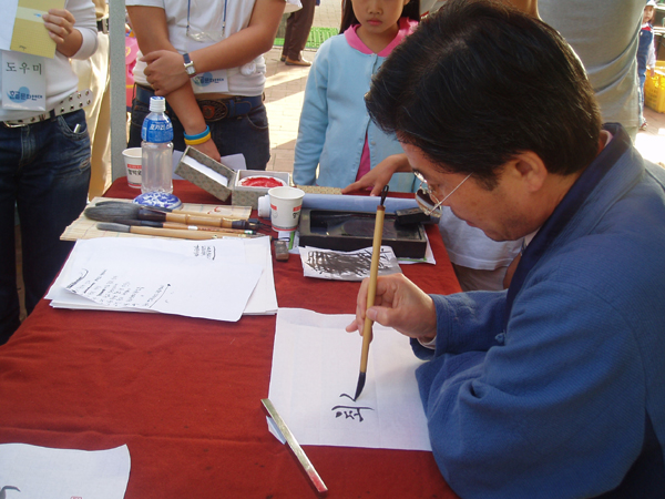 2005년 10월 9일 (일) 오후 1시부터 선유도 공원(양화대교 중간)에서 있었던 한글문화연대 주최 559돌 한글날 기념 '2005 으뜸 한글 온누리에' 행사의 한 모습입니다. 사진은 솔뫼 서예실 천갑녕 대표께서 '한글 가훈 써 주기'를 하고 있는 모습입니다. <찍은 이: 꿈돌이(2005.10.9.)>