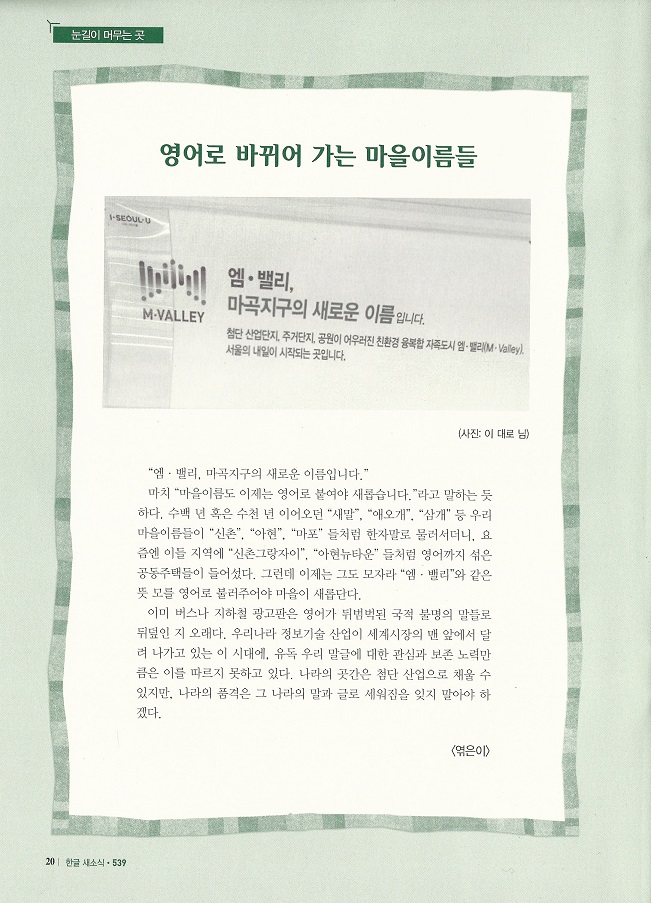 마치 '마을이름도 이제는 영어로 붙여야 새롭습니다'라고 말하는 듯하다. 수백 년 혹은 수천 년 이어오던 '새말', '애오개', '삼개' 등 우리 마을이름들이 '신촌', '아현', '마포' 들처럼 한자말로 물러서더니, 요즘엔 이들 지역에 '신촌그랑자이', '아현뉴타운' 들처럼 영어까지 섞은 공동주택들이 들어섰다. 그런데 이제는 그도 모자라 '엠·밸리'와 같은 뜻 모를 영어로 불러주어야 마을이 새롭단다.