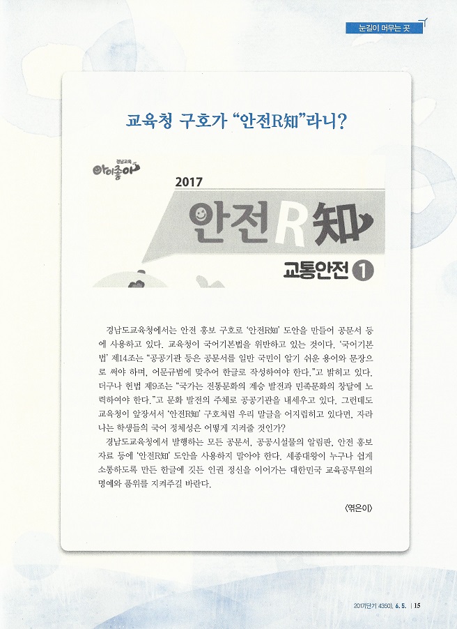 경남도교육청에서는 안전 홍보 구호로 '안전R知' 도안을 만들어 공문서 등에 사용하고 있다. 교육청이 국어기본법을 위반하고 있는 것이다. '국어기본법' 제14조는 '공공기관 등은 공문서를 일반 국민이 알기 쉬운 용어와 문장으로 써야 하며, 어문규범에 맞추어 한글로 작성하여야 한다.'고 밝히고 있다. 더구나 헌법제9조는 '국가는 전통문화의 계승 발전과 민족문화의 창달에 노력하여야 한다.'고 문화 발전의 주체로 공공기관을 내세우고 있다. 그런데도 교육청이 앞장서서 '안전R知' 구호처럼 우리 말글을 어지럽히고 있다면, 자라나는 학생들의 국어 정체성은 어떻게 지켜줄 것인가?