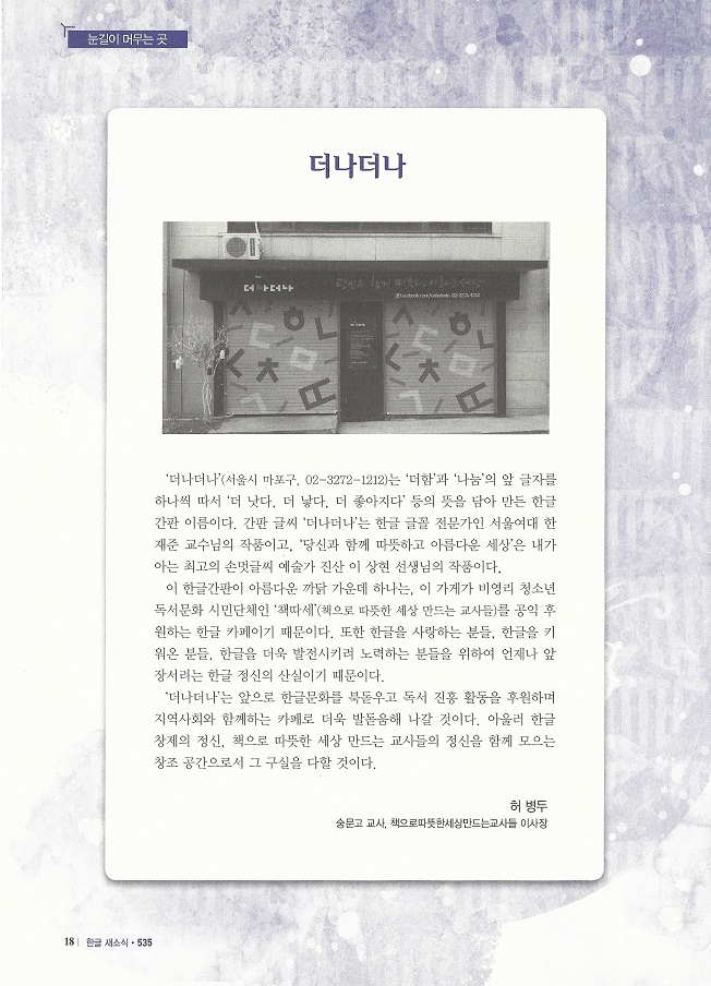 이 한글간판이 아름다운 까닭 가운데 하나는, 이 가게가 비영리 청소년 독서문화 시민단체인 '책따세'(책으로 따뜻한 세상 만드는 교사들)를 공익 후원하는 한글 카페이기 때문이다. 또한 한글을 사랑하는 분들, 한글을 키워온 분들, 한글을 더욱 발전시키려 노력하는 분들을 위하여 언제나 앞장서려는 한글 정신의 산실이기 때문이다.