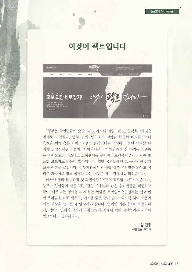 마침애 청와대 누리집 첫 화면에도 '이것이 팩트입니다'가 떴습니다. 누구나 알아듣기 쉬운 '참', '진실', '사실'과 같은 우리말들을 외면하고 굳이 '팩트'라는 영어를 써야 하는 까닭은 무엇일까요? 정부는 쉽고 편한 우리말을 바로 세우고, 어려운 말은 쉽게 쓸 수 있도록 하여 소통이 쉬운 세상을 만드는 데 앞장서야 합니다. 언어란 기본적으로 소통입니다. 적어도 언어가 장벽이 되지 않도록 최대한 쉽게 전달하려는 노력이 필요하다고 생각합니다.