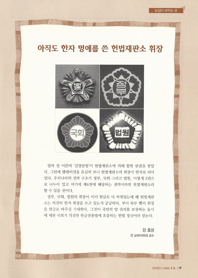 얼마 전 이른바 '김영란법'이 헌법재판소에 의해 합헌 판결을 받았다. 그런데 텔레비전을 유심히 보니 헌법재판소의 휘장이 한자로 되어 있다. 우리나라의 권력 구조가 정부, 국회 그리고 법원, 이렇게 3권으로 나누어 있고 여기에 제4권에 해당하는 권력이라면 헌법재판소라 할 수 있을 것이다.