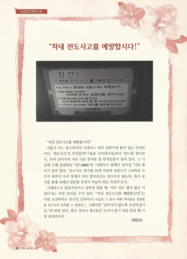 서울시 어느 운수회사의 시내버스 의자 등받이에 붙어 있는 주의문이다. '전도사고'가 무엇일까? 『표준 국어대사전』에서 '전도'를 찾아보니, 무려 19가지의 서로 다른 한자로 된 한자말들이 올라 있다. 그 가운데 17째 올림말인 '전도(轉倒)'에 '사람이나 물체가 넘어짐.'이란 풀이가 달려 있다. '전도'라는 한자말 19개 가운데 상당수가 그러하듯 도무지 예부터 우리 땅에서 써온 말이라고는 믿어지지 않는다. 혹시 문서를 통해 전해진 일본말 잔재가 아닐까 하는 의심이 든다.