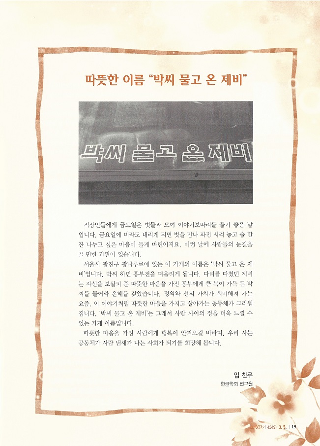 서울시 광진구 광나루로에 있는 이 가게의 이름은 '박씨 물고 온 제비'입니다. 박씨 하면 흥부전을 떠올리게 됩니다. 다리를 다쳤던 제비는 자신을 보살펴 준 따뜻한 마음을 가진 흥부에게 큰 복이 가득 든 박씨를 물어와 은혜를 갚았습니다. 정의와 선의 가치가 희미해져 가는 요즘, 이 이야기처럼 따뜻한 마음을 가지고 살아가는 공동체가 그리워집니다. '박씨 물고 온 제비'는 그래서 사람 사이의 정을 더욱 느낄 수 있는 가게 이름입니다.