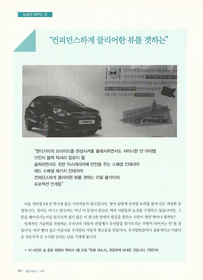 세계적인 기술력을 자랑하는 우리나라 자동차 산업계가 우리말을 망가뜨리는 주범이 되어서는 안 될 것입니다. 하루 빨리 쉽고 아름다운 우리말로 자동차 광고문을 만들어서, 우리말만큼이나 실용적이고 아름다운 자동차가 온 누리를 달리는 날을 기대해 봅니다.