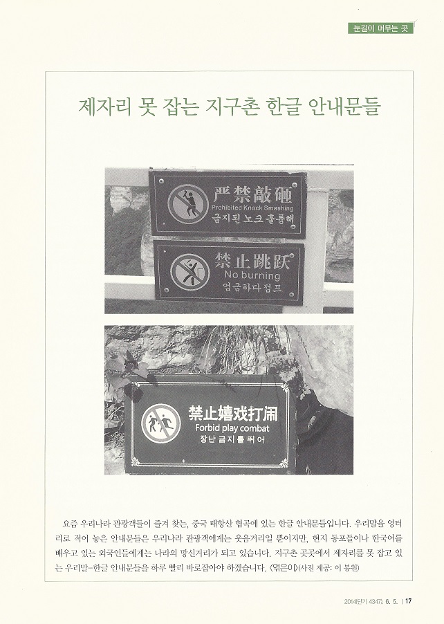 요즘 우리나라 관광객들이 즐겨 찾는, 중국 태항산 협곡에 있는 한글 안내문들입니다. 우리말을 엉터리로 적어 놓은 안내문들은 우리나라 관광객에게는 웃음거리일 뿐이지만, 현지 동포들이나 한국어를 배우고 있는 외국인들에게는 나라의 망신거리가 되고 있습니다. 지구촌 곳곳에서 제자리를 못 잡고 있는 우리말―한글 안내문들을 하루 빨리 바로잡아야 하겠습니다. <엮은이>(사진 제공: 이 봉원)