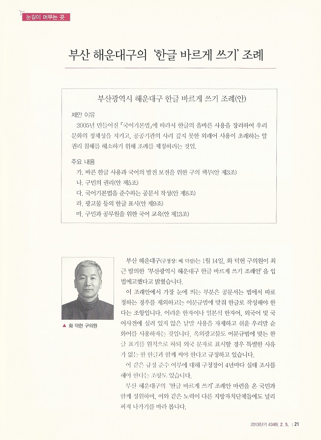 부산 해운대구(구청장: 배 덕광)는 1월 14일, 화 덕헌 구의원이 최근 발의한 '부산광역시 해운대구 한글 바르게 쓰기 조례안'을 입법예고했다고 밝혔습니다.