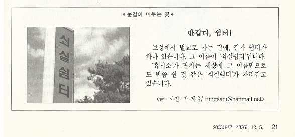 '휴게소'가 판치는 세상에 그 이름만으로도 반쯤 쉰 것 같은 '쉬실쉼터'가 자리잡고 있습니다.