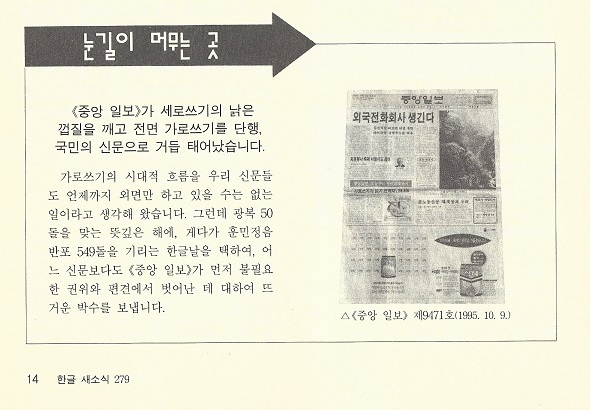 가로쓰기의 시대적 흐름을 우리 신문들도 언제까지 외면만 하고 있을 수는 없는 일이라고 생각해 왔습니다. 그런데 광복 50돌을 맞는 뜻깊은 해에, 게다가 훈민정음 반포 549돌을 기리는 한글날을 택하여, 어느 신문보다도 《중앙 일보》가 먼저 불필요한 권위와 편견에서 벗어난 데 대하여 뜨거운 박수를 보냅니다.