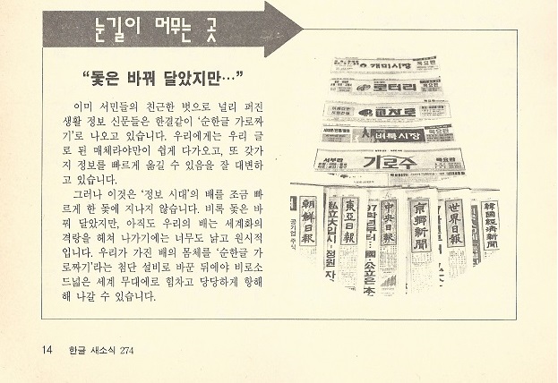 이미 서민들의 친근한 벗으로 널리 퍼진 생활 정보 신문들은 한결같이 '순한글 가로짜기'로 나오고 있습니다. 우리에게는 우리 글로 된 매체라야만이 쉽게 다가오고, 또 갖가지 정보를 빠르게 옮길 수 있음을 잘 대변하고 있습니다.