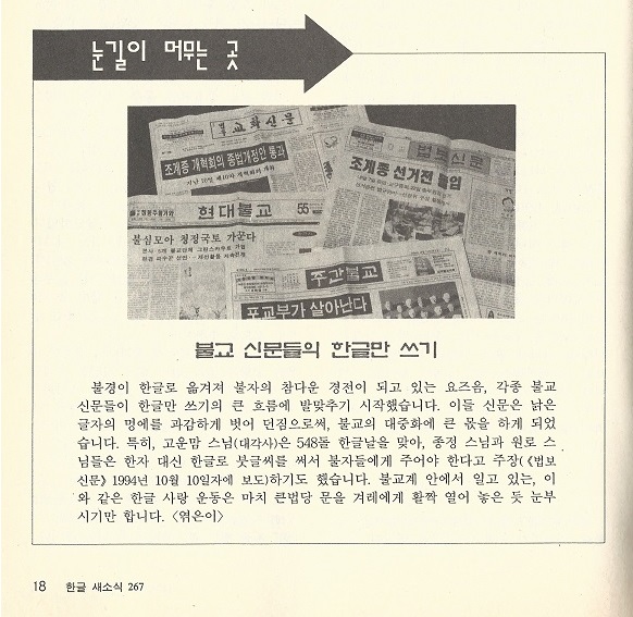 불경이 한글로 옮겨져 불자의 참다운 경전이 되고 있는 요즈음, 각종 불교 신문들이 한글만 쓰기의 큰 흐름에 발맞추기 시작했습니다. 이들 신문은 낡은 글자의 멍에를 과감하게 벗어 던짐으로써, 불교의 대중화에 큰 몫을 하게 되었습니다. 특히, 고운맘 스님(대각사)은 548돌 한글날을 맞아, 종정 스님과 원로 스님들은 한자 대신 한글로 붓글씨를 써서 불자들에게 주어야 한다고 주장(《법보신문》1994년 10월 10일자에 보도)하기도 했습니다. 불교계 안에서 일고 있는, 이와 같은 한글 사랑 운동은 마치 큰법당 문을 겨레에게 활짝 열어 놓은 듯 눈부시기만 합니다. <엮은이>