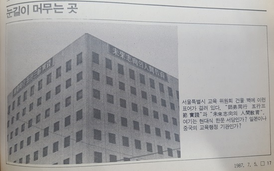 이미 한글학회에서 우리 말글 활동을 담은 월간지 '한글새소식'(1972년 9월 창간) 제179호(1987. 7. 5.)에 서울시 교육위원회(지금의 교육청) 건물 벽에 걸린 한자 표어의 모습(사진 참조)을 담은 것이 그 처음이 아닌가 싶습니다. 이때부터 '눈길이 머무는 곳'이란 마당을 만들어 알리다가 2023년 2월호(제606호)부터는 '눈길이 머무는 것'과 '눈길이 멈추는 것'으로 나누어 싣고 있습니다.