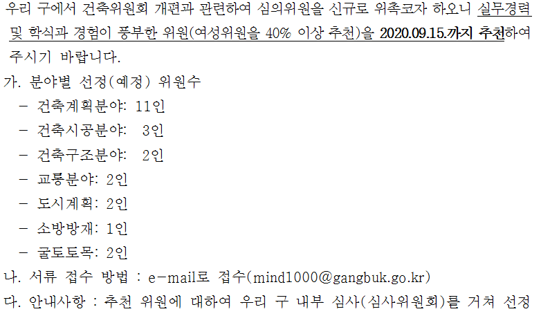 [강북구 건축과] 강북구 건축위원회 위원 추천 요청