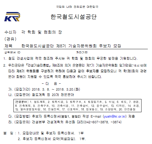 [한국철도시설공단] 8기 기술자문위원회 후보자 모집