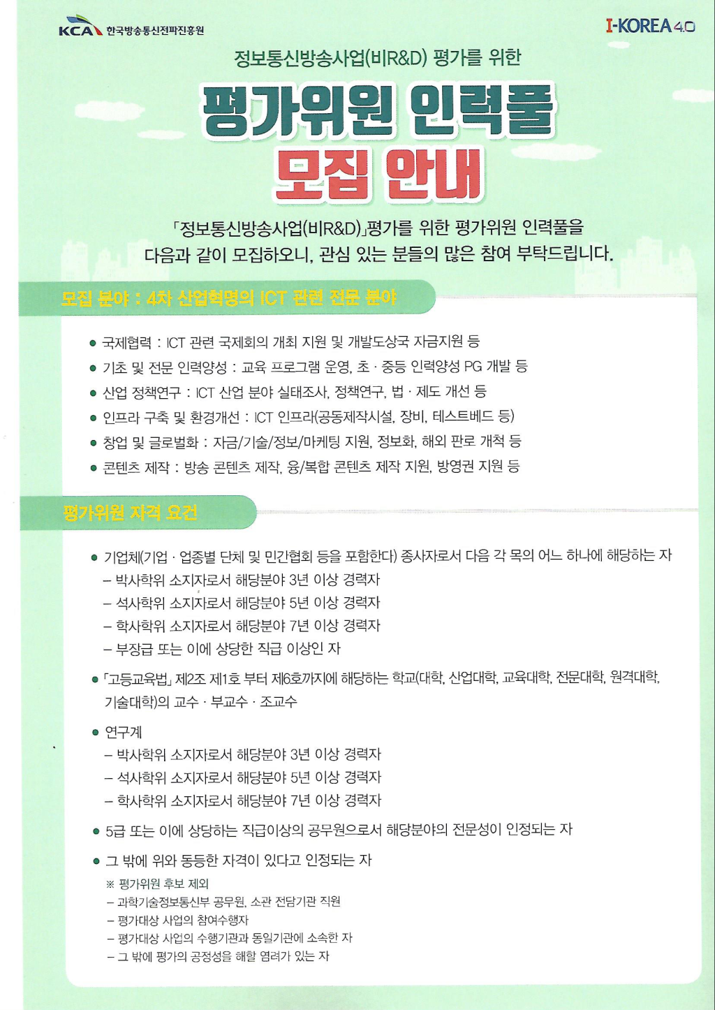정보통신방송사업(비R&D) 평가를 위한 평가위원 인력풀 모집 안내에 대해 안내드립니다