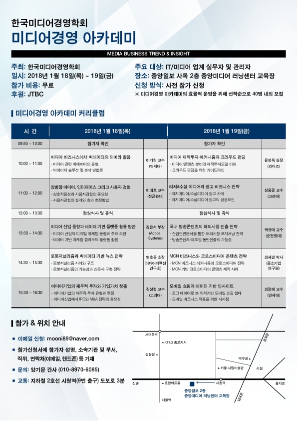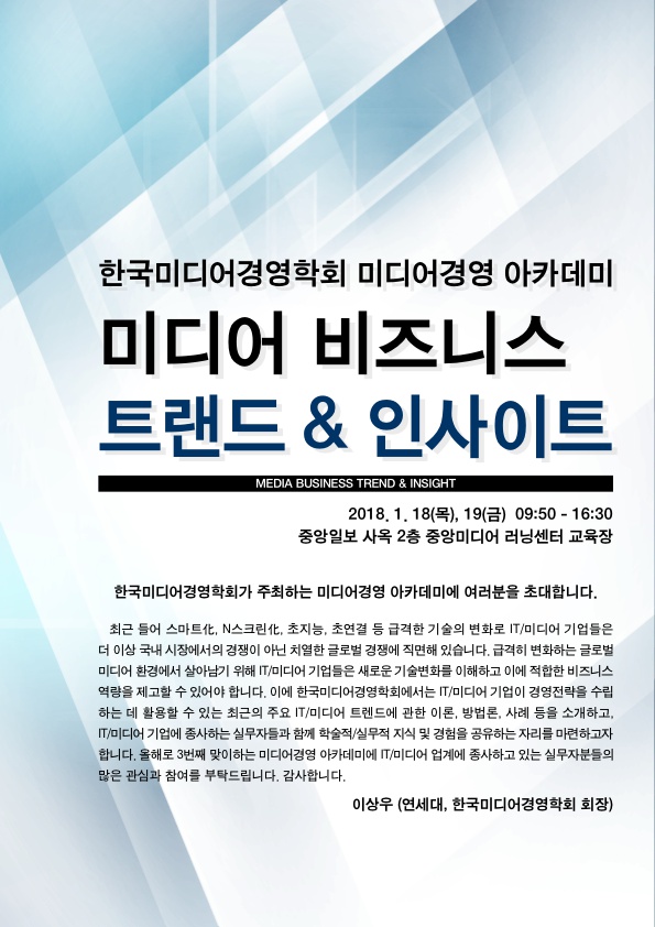 한국미디어경영학회는 오는 2018년 1월 18일(목) 부터 19일(금) 까지, 중앙일보 사옥 2층에서 '한국미디어경영학회 - 미디어경영 아카데미'를 개최합니다.