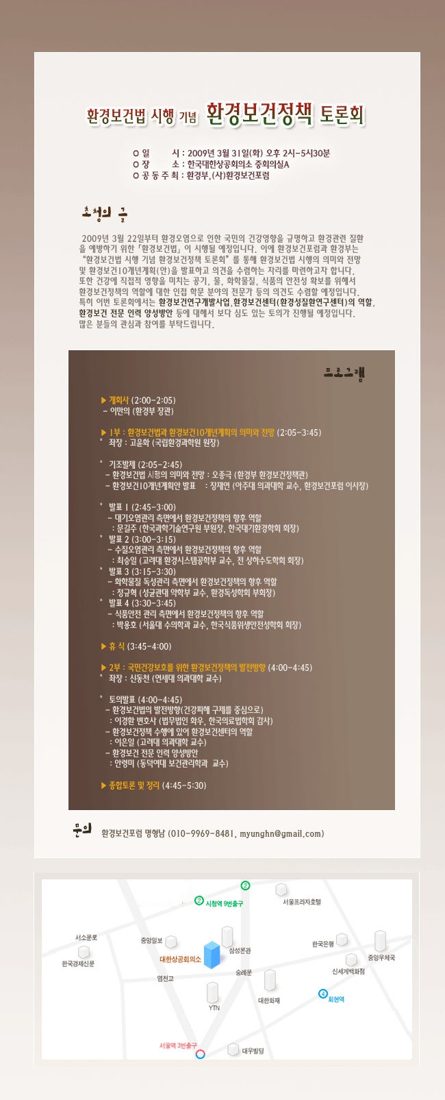 2009년 3월 22일부터 환경오염으로 인한 국민의 건강영향을 규명하고 환경관련 질환을 예방하기 위한 [환경보건법] 이 실행될 예정입니다. 이에 환경보건포럼과 환경부는 '''환경보건법 시행 기념 환경보건정책 토론회'' 를 통해 환경보건법 시행의 의미와 정망 및 환경보건 10개년계획(안)을 발표하고 의견을 수렴하는 자리를 마련하고자 합니다. 또한 건강에 직접적 영향을 미치는 공기, 물, 화학물질, 식품의 안전성을 확보를 위해서 환경보건정책의 역할에 대한 인접 학문 분야의 전문가 등의 의견도 수렴할 예정입니다. 특히 이번 토론회에서는 환경보건연구개발사업, 환경보건센터(환경성질환연구센터) 역할, 환경보건 전문 인력 양성방안 등에 대해서 보다 심도 있는 토의가 진행될 예정입니다.