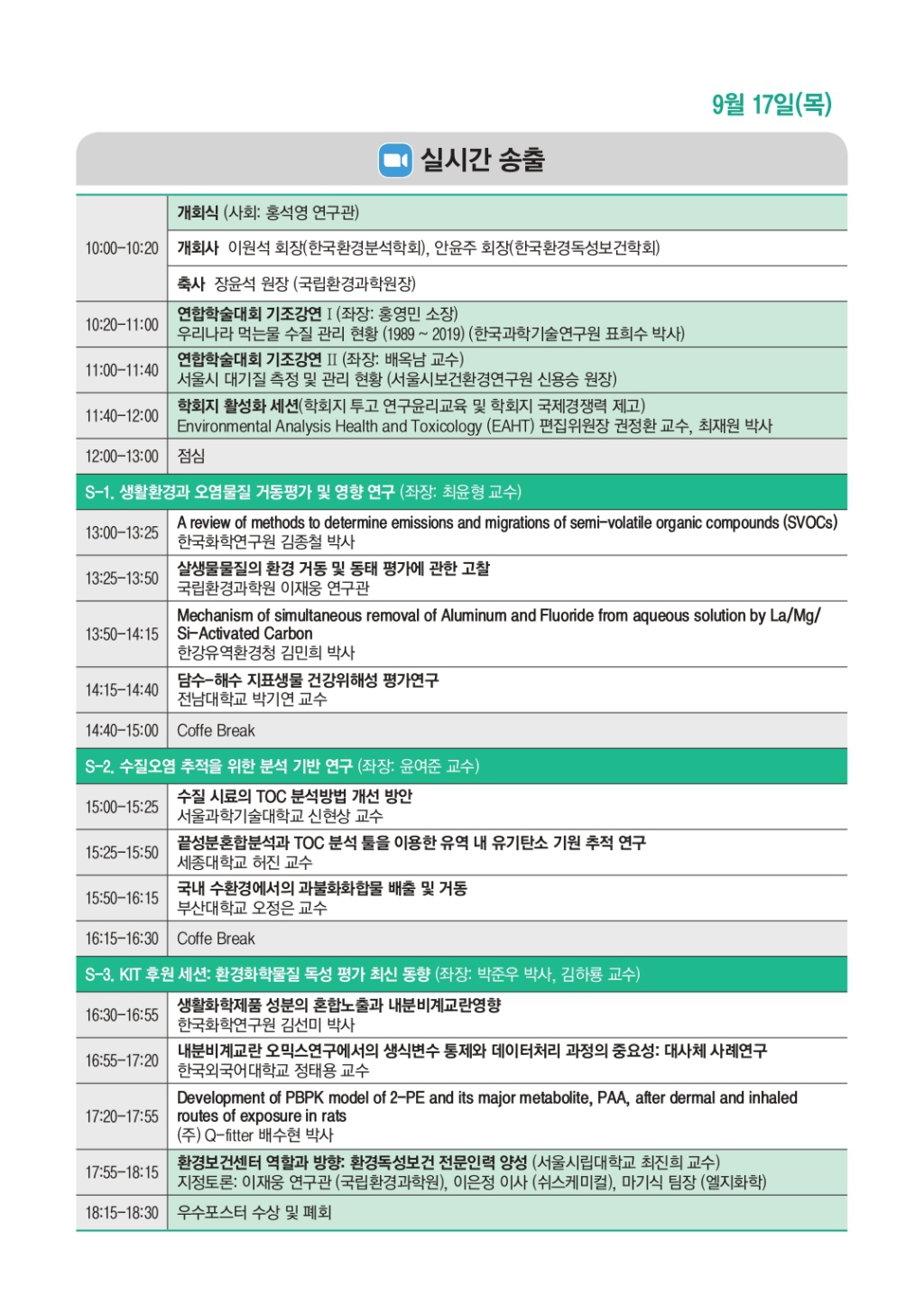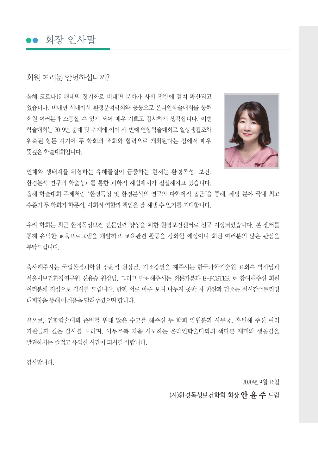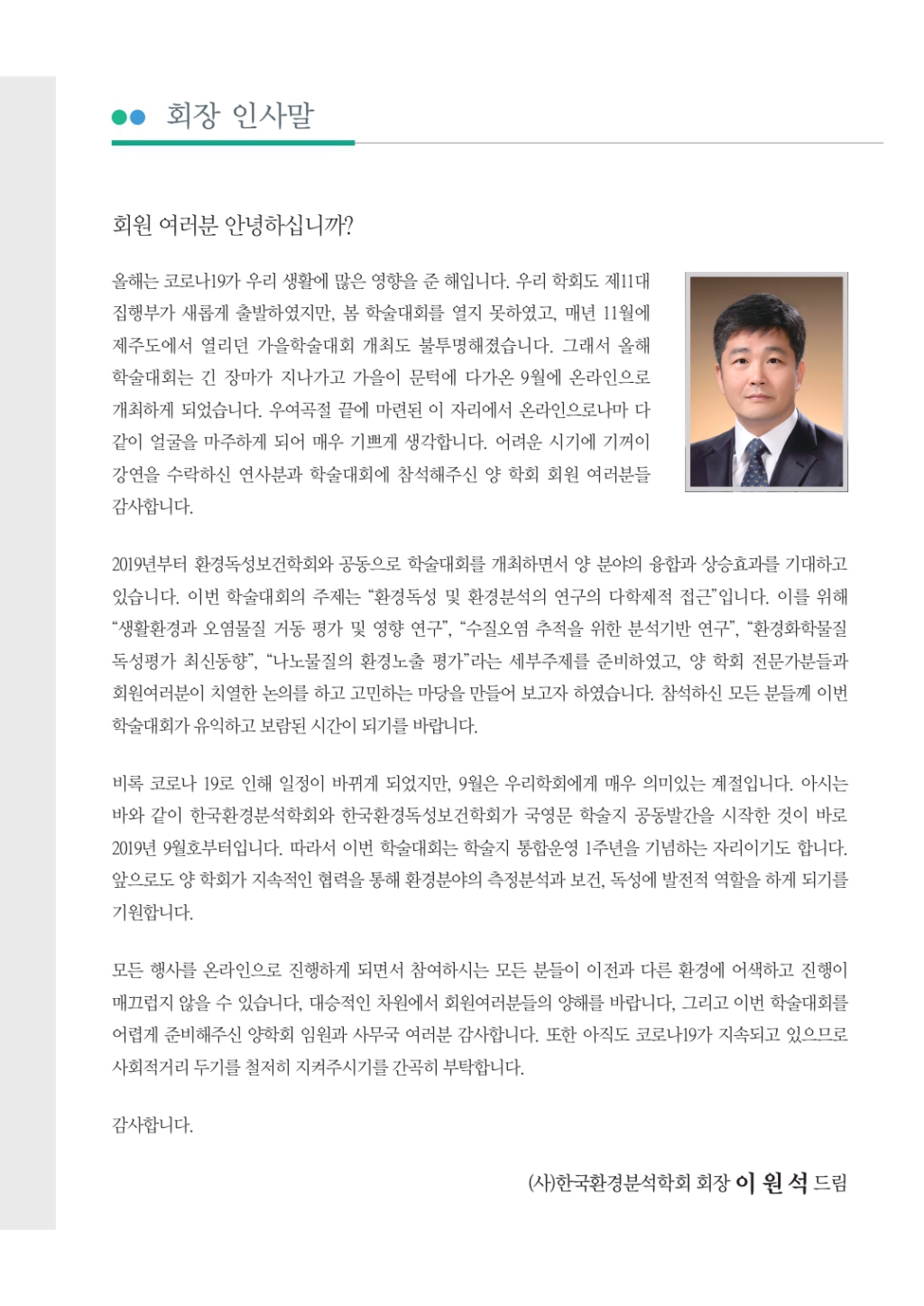 2020년도 환경독성보건학회/환경분석학회 연합(추계)학술대회 인사말 및 프로그램 안내